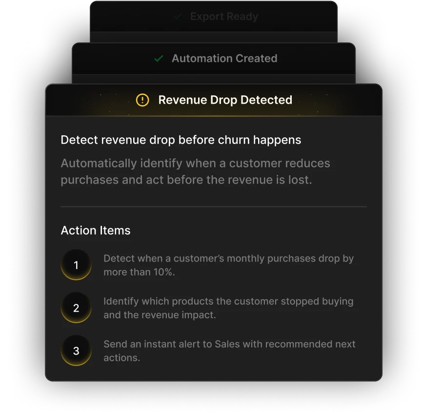 One platform that connects all your systems (ERP, POS, CRM, Accounting) and transforms your data into real-time intelligence, automated workflows, predictive insights, alerts, reports, and a 24/7 AI business chatbot.